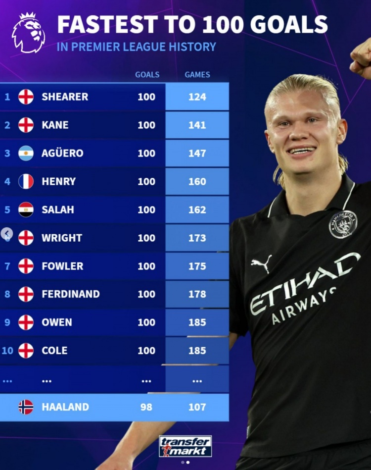 11月3日讯 德转盘点了英超历史达成百球最快用时榜,而哈兰德107场98球十分有望创造新的纪录,以下为具体榜单: